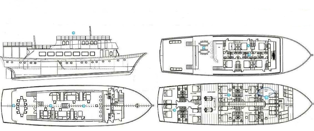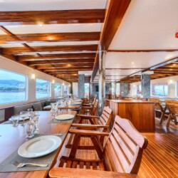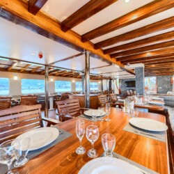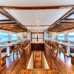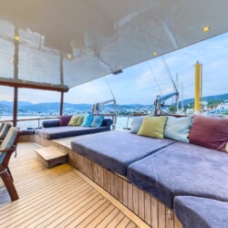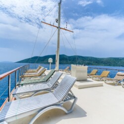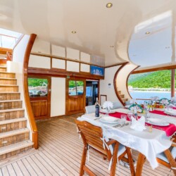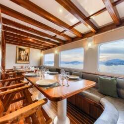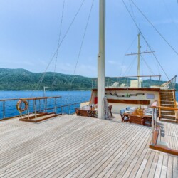 The spacious deck areas of Love Boat are one of its most remarkable highlights. Guests can enjoy expansive sunbathing areas, comfortable lounge spaces, and beautifully arranged outdoor dining settings, perfect for taking in panoramic sea views. Inside, the elegant saloon provides a stylish retreat with comfortable seating, a dining area, and entertainment options, creating a welcoming environment for socializing and relaxation.